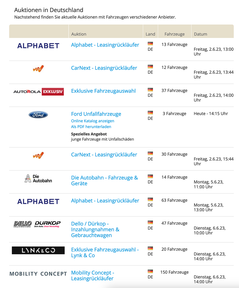 Auf der Startseite der Marketplace Website unter www.autorola.de finden Sie eine Übersicht aller unserer Auktionen. Unter der Überschrift "Auktionen in Deutschland" finden Sie alle Auktionen, die durch unsere Sales Consultants in Deutschland betreut und abgewickelt werden. Diese stehen Ihnen gerne zur Seite und unterstützen Sie bei aufkommenden Fragen.